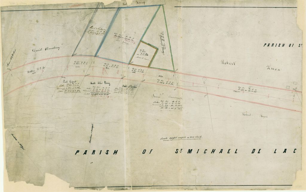 - Ce plan présente les emprises pour la contruction de l'aqueduc de la Montreal Water Works depuis le fleuve Saint-Laurent, à Lachine, jusqu'à la ferme Saint-Grégroire à Montréal. Le nom des paroisses ainsi que le nom des propriétaires des terrains qui seront expropriés en partie sont localisés. Les superficies à exproprier sont indiquées pour chaque terrain. Quelques maisons ou granges sont localisées ici et là sur le plan