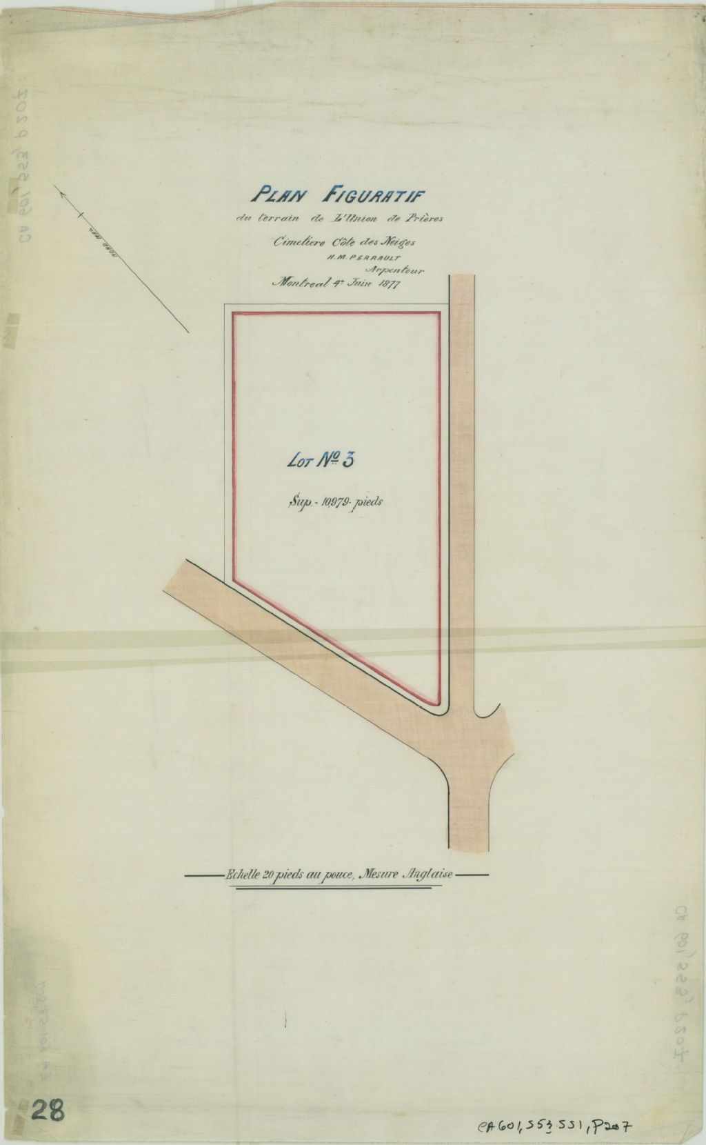 Ce plan présente le lot n° 3 d'une section du cimetière de Notre-Dame-des-Neiges réservé pour les membres de l'Union des Prières. Il s'agit des lots n° 9 et 10 du cadastre du village de la Côte-des-Neiges. La superficie du lot est indiquée