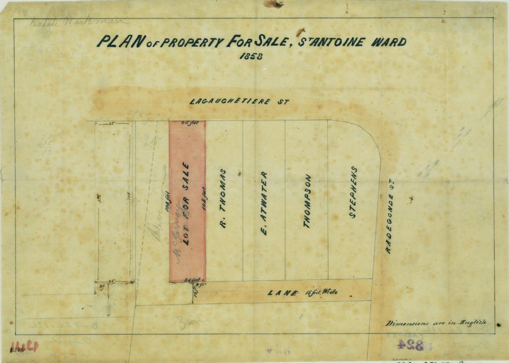 Ce plan présente une propriété appartenant à la succession Workman. Cette propriété est située sur la rue Lagauchetière à Montréal. Il s'agit du lot n° 1092 du cadastre du quartier Saint-Antoine de la cité de Montréal. Les voisins sont l'église Zion, R. Thomas, E. Atwater, Monsieur Thompson et Monsieur Stephens. Les mesures du lot sont indiquées