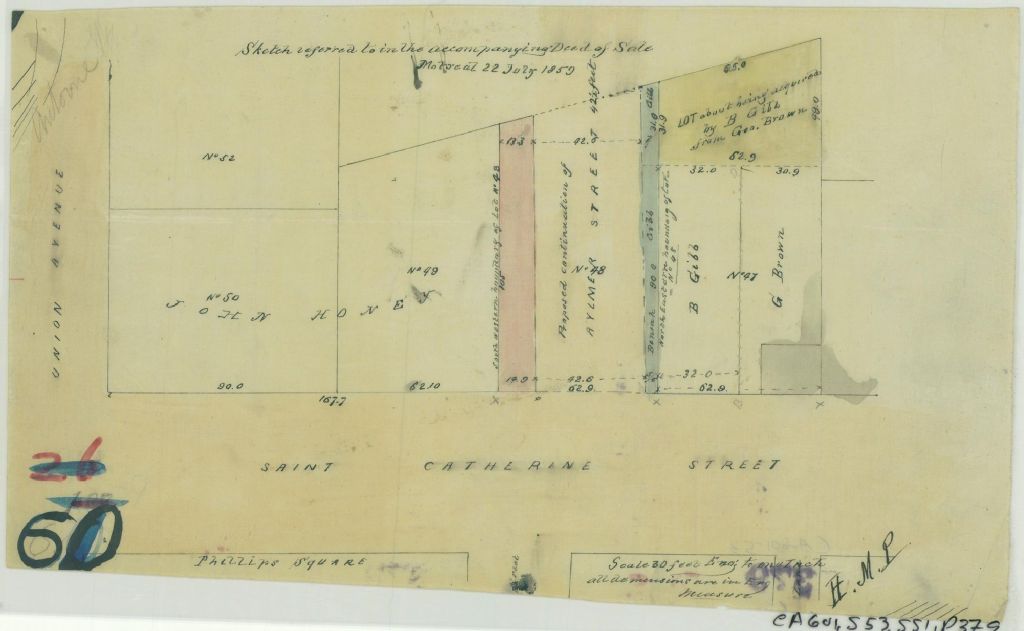 Ce plan présente la propriété de John Honey, B. Gibb et G. Brown sur la rue Sainte-Catherine à Montréal. Un contrat de vente est préparé pour l'ouverture de la future rue Aylmer et la vente d'un lopin de terrain de George Brown à B. Gibb. Ce sont les lots n° 1134-1135 et 1173-1174 du cadastre du quartier Saint-Antoine de la cité de Montréal. Les lots sont situés face au Square Phillips. Les mesures des lots et de la future rue sont indiquées