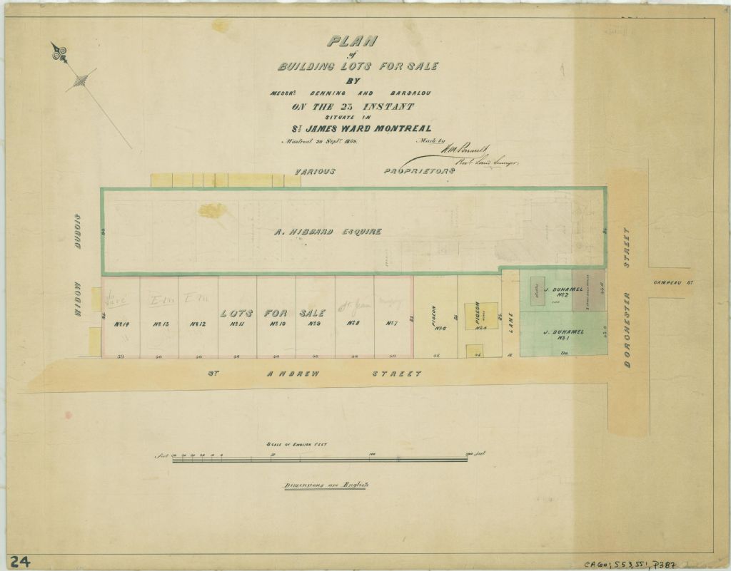 Ce plan présente les lots appartenant à Benning et Barsalou. Ces lots sont situés à l'intersection des rues Dorchester (devenue boulevard René-Lévesque) et Saint-André à Montréal. Ce sont les lots n° 541 à 548 du cadastre du quartier Saint-Jacques de la cité de Montréal.Monsieur J. Duhamel possède une résidence de deux étages en brique et une grange localisées sur les lots de l'intersection. Monsieur Pigeon possède deux autres lots avec une maison et une remise qui y sont localisées. D'autres lots sont vendus à Messieurs Murphy, Saint-Jean, Elm et Paré. Sur le terrain du voisin immédiat, monsieur A. Hibbard, une résidence, une étable, un jardin et un verger sont localisés en lignes pointillées