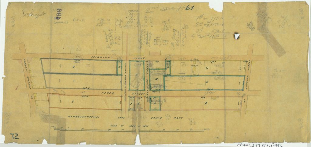 Le plan présente les terrains situés dans le quadrilatère formé par les rues Saint-Joseph (devenue Notre-Dame), des Seigneurs, Saint Antoine et Saint-Pierre (devenue Saint-Martin) à Montréal. Ce sont les lots n° 299 à 386 et 403 à 417 du cadastre du quartier Saint-Antoine de la cité de Montréal. Les terrains sont divisés en sept parties identifiées par des lettres. Les mesures de chaque partie sont indiquées