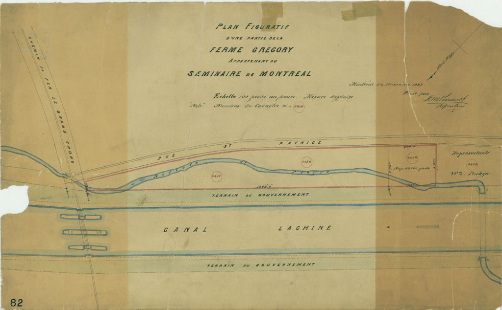 Ce plan présente les lots n° 3409 à 3411 du cadastre de la municipalité de la paroisse de Montréal situés entre la rue Saint-Patrice, le Canal Lachine et du chemin de fer du Grand Tronc à Montréal. La rivière Saint-Pierre traverse les lots. Le voisin est William Parkyn. Les mesures et la superficie des lots sont indiquées