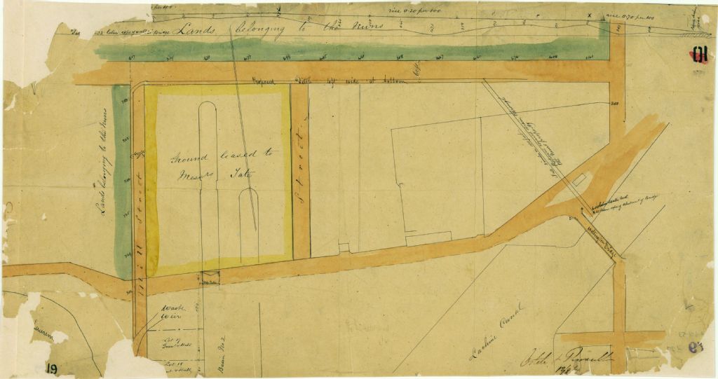 Le plan présente l'emplacement d'un fossé d'assainissement sur des terrains appartenant aux Soeurs Grises et à Monsieur Tate. Ce terrain est situé entre le pont Wellington (sur le canal Lachine) et la rue Mill et entre le canal Lachine et la rue Bridge. Les noms des propriétaires, certaines constructions et les dimensions des lots sont indiqués