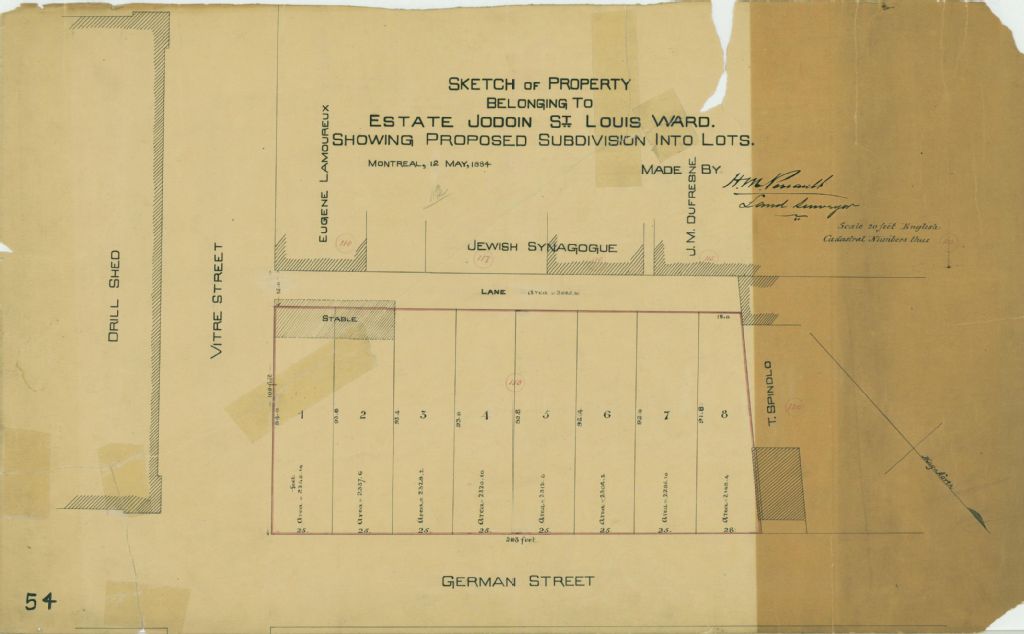 Ce plan présente le lot n° 119 du cadastre du quartier Saint-Louis de la cité de Montréal. Ce lot appartient aux héritiers de feu Monsieur Jodoin. Il est situé à l'intersection des rues Vitré (devenue Viger) et Germain (devenue avenue de l'Hôtel-de-Ville) à Montréal.Le lot est subdivisé en 8 lotissements. Une grange est localisée sur le lot. Les voisins sont Eugène Lamoureux, une synagogue juive, J. M. Dufresne et T. Spinolo. Les mesures et les superficies des lotissements sont indiquées