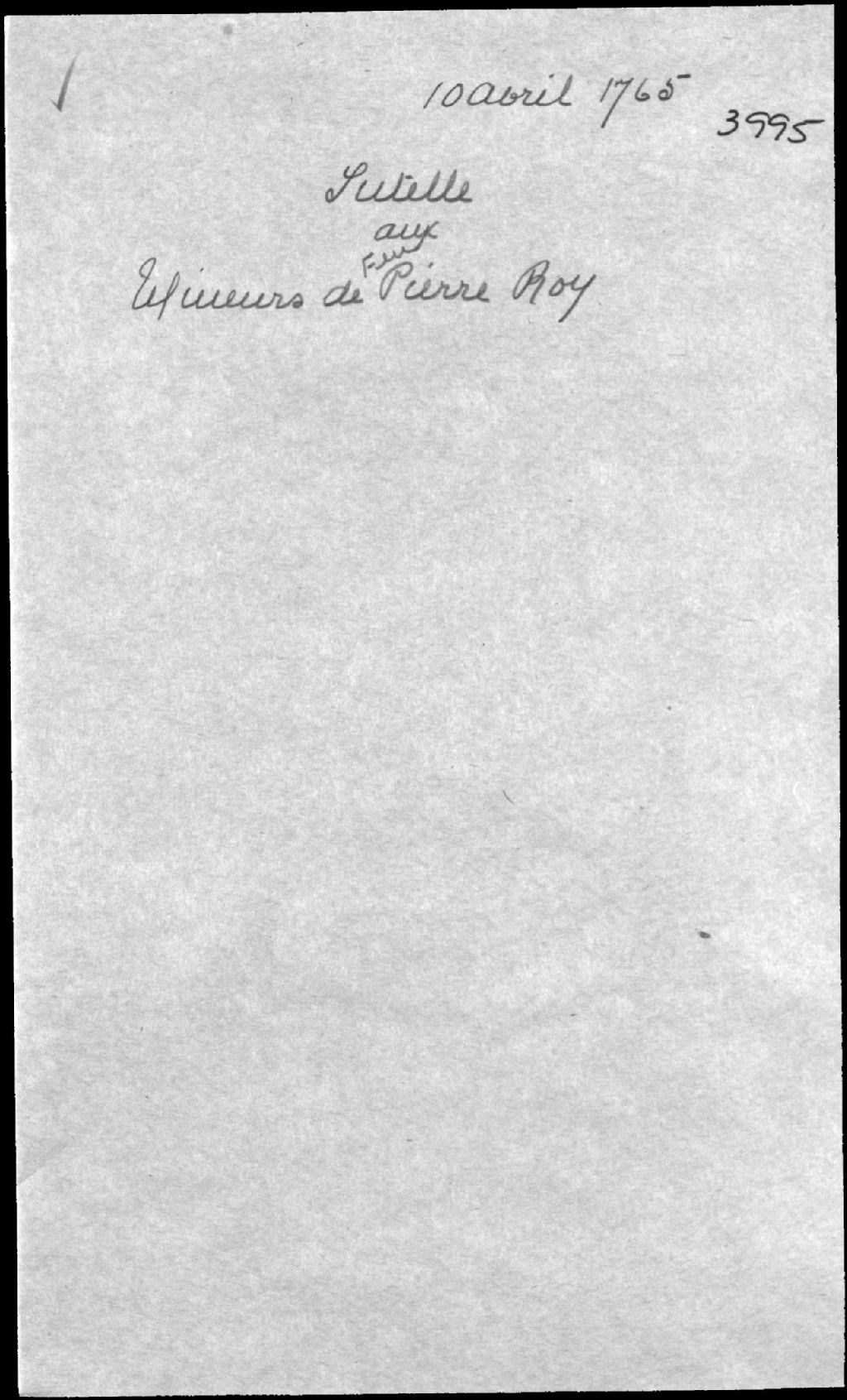 Tutelle aux mineurs de feu Pierre Roy, de Saint-Vallier (Saint-Vallier-de-Bellechasse), et de feue Marie Gautron LaRochelle (Larochelle), 10 avril 1765, Archives nationales à Québec, Fonds Cour supérieure. District judiciaire de Québec. Tutelles et curatelles, (03Q,CC301,S1,D3995).