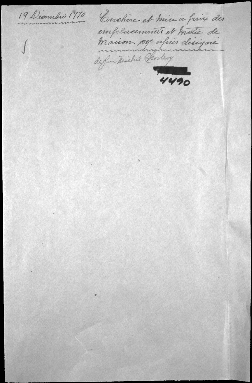 Enchère et mise à prix d'un emplacement et la moitié d'une maison situés en la ville de Québec, rue Saint-Georges, appartenant à Michel Charlery, habitant de la ville de Québec, et à feue Marguerite Roza (Rosa) Barthélémy, 19 décembre 1770, Archives nationales à Québec, Fonds Cour supérieure. District judiciaire de Québec. Tutelles et curatelles, (03Q,CC301,S1,D4490).