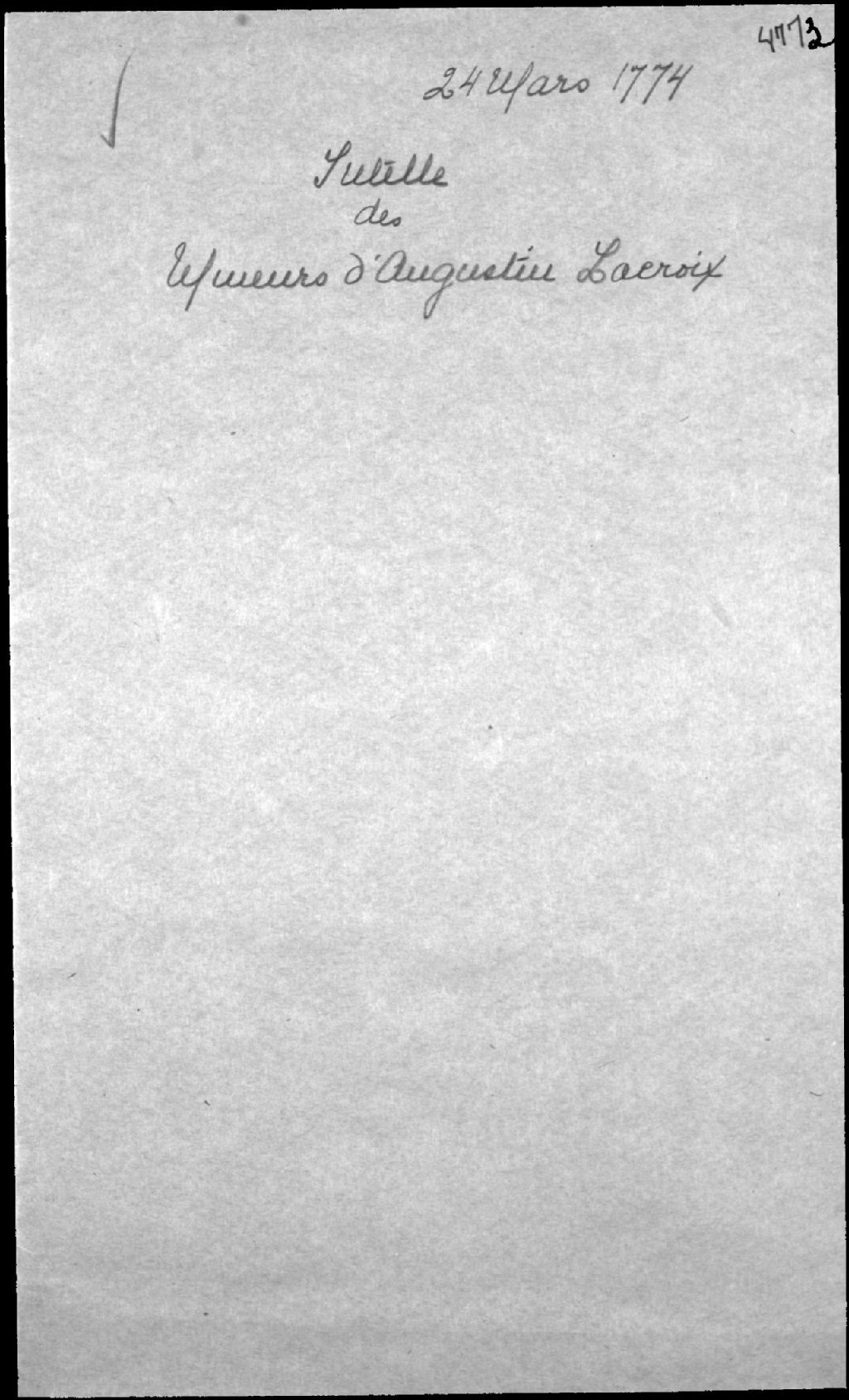 Tutelle aux mineurs d'Augustin Lacroix, habitant de Saint-Charles (Saint-Charles-de-Bellechasse), et de feue Geneviève Montminy (Montmigny, Monminy, Montmenil, Montmesnil), 24 mars 1774 et 6 avril 1774, Archives nationales à Québec, Fonds Cour supérieure. District judiciaire de Québec. Tutelles et curatelles, (03Q,CC301,S1,D4773).