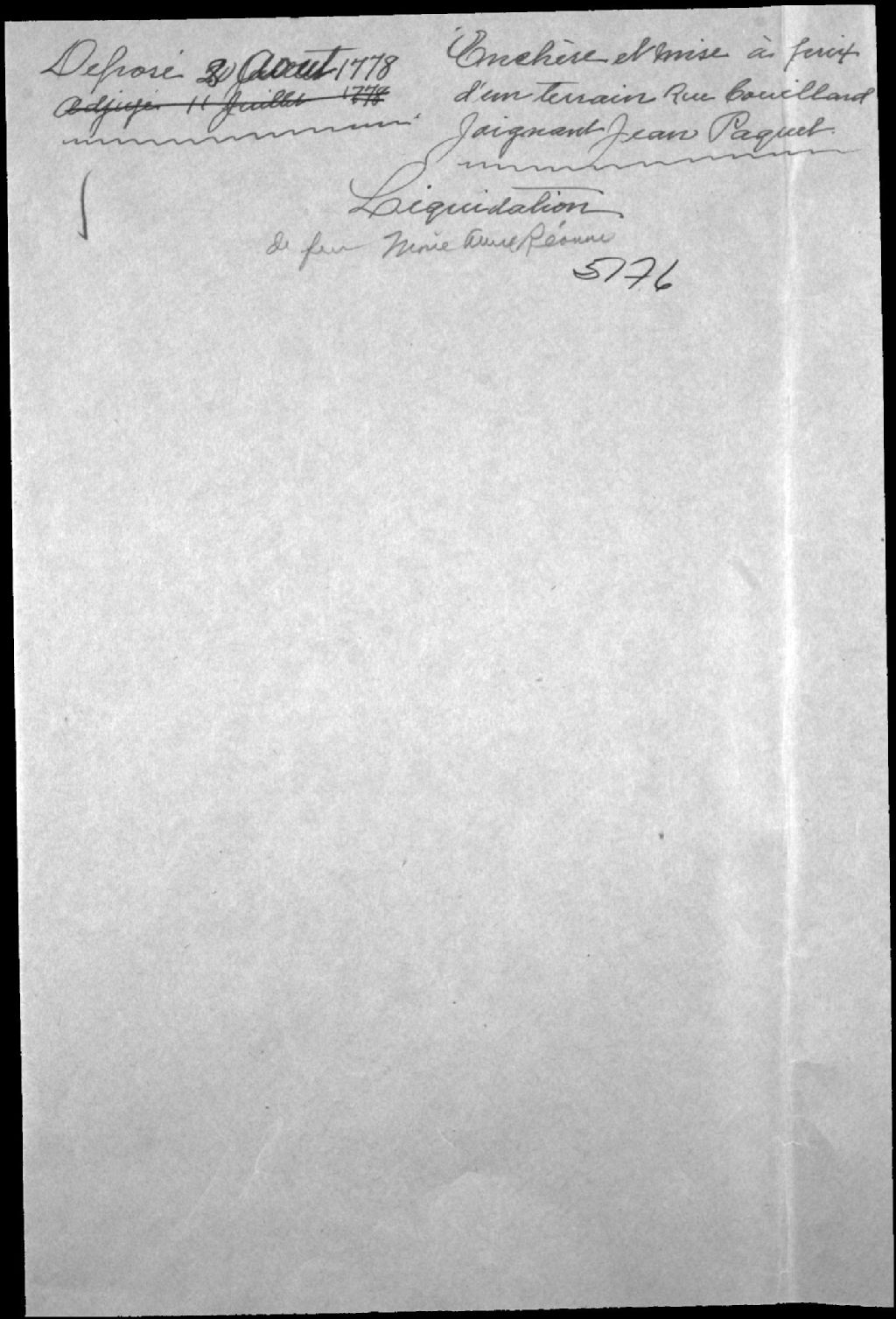 Enchère et mise à prix d'un terrain situé en la Haute-Ville de Québec, rue Couillard, appartenant aux héritiers de François Bellet, navigateur, et de feue Marie-Anne (Marianne) Réaume (Rhéaume)