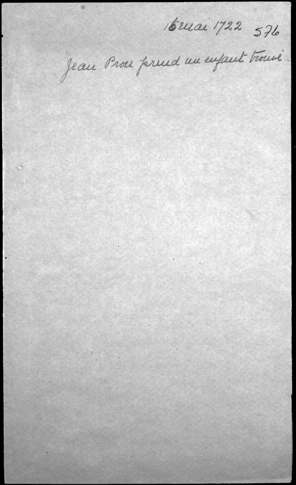 Procès-verbal de remise d'un enfant trouvé dans la chapelle de la Congrégation du Collège des Jésuites, à Québec, à Jean Proulx (Prou), de Neuville, et à Catherine Aubert, 16 mai 1722, Archives nationales à Québec, Fonds Cour supérieure. District judiciaire de Québec. Tutelles et curatelles, (03Q,CC301,S1,D576).