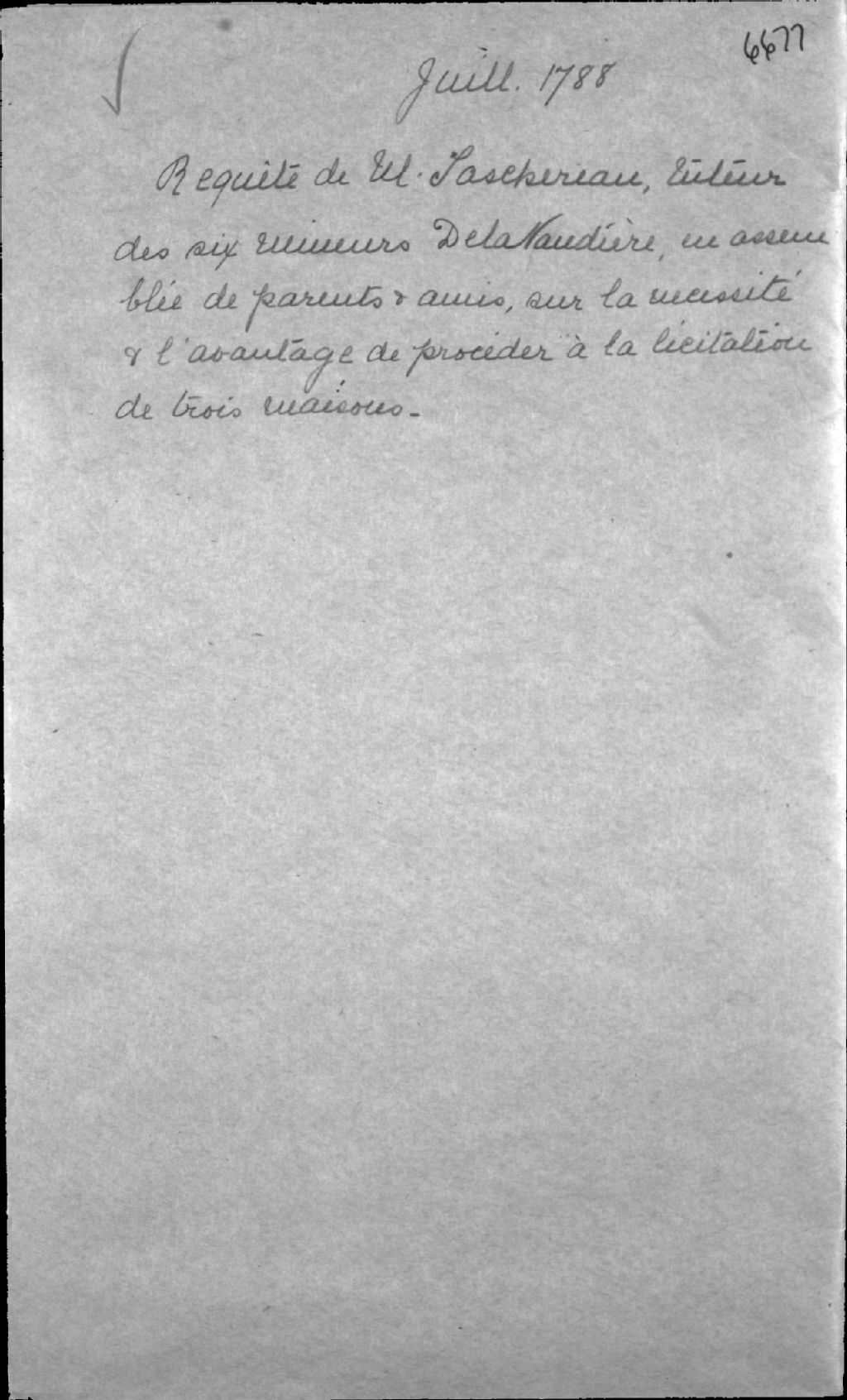 Requête et assemblée de parents et amis afin d'autoriser la vente de trois terres pour les mineurs de feu Charles-François Tarieu de Lanaudière, écuyer, chevalier de l'Ordre royal et militaire de Saint-Louis, membre du Conseil législatif, seigneur de Saint-Vallier, Saint-Pierre-les-Becquets et autres lieux, et de feue Catherine Lemoine (Lemoyne) de Longueuil