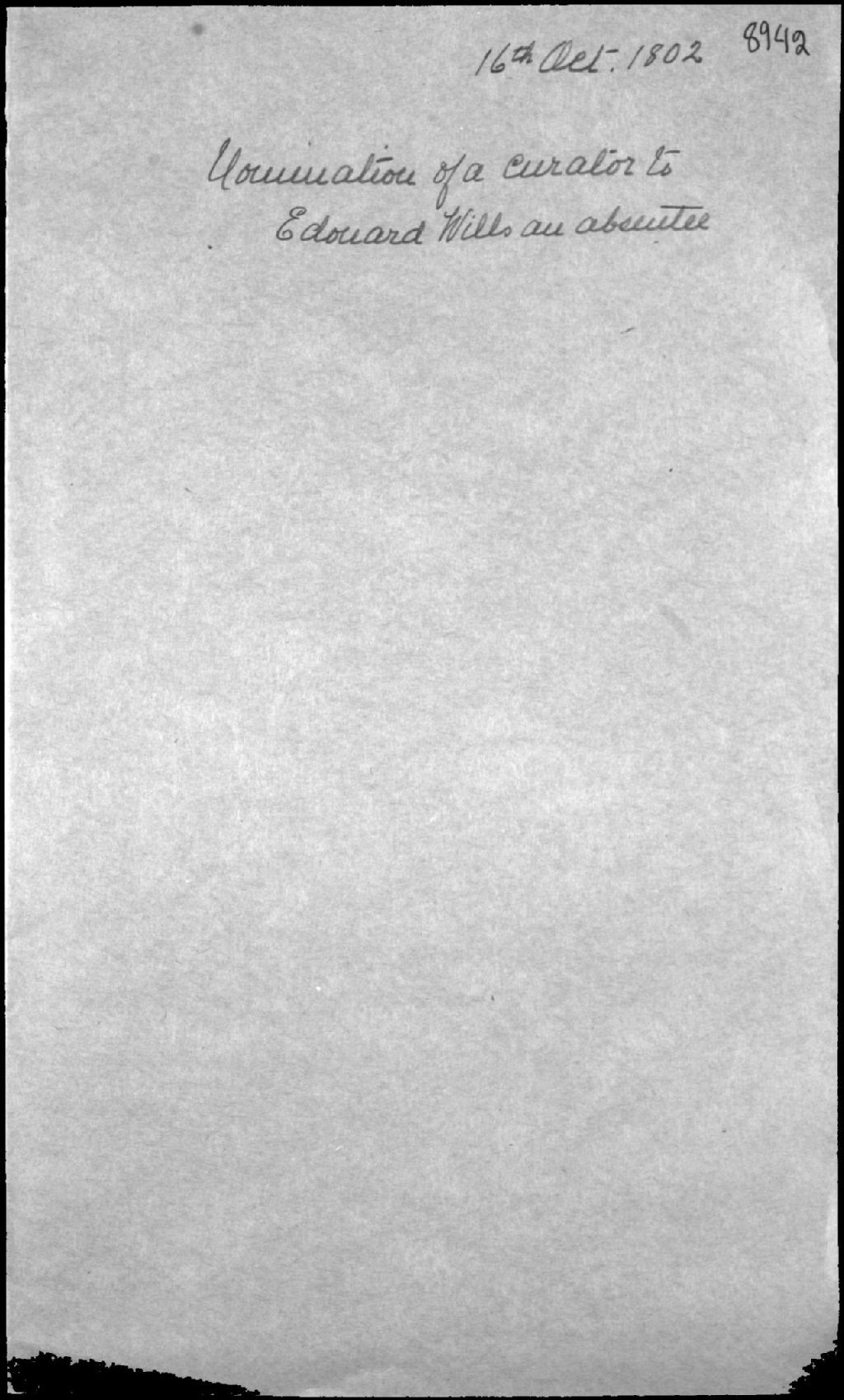 Homologation de la curatelle d'une personne absente enfant de feu Meredith Wills, encanteur (commissaire-priseur) de Québec, et de feue Geneviève Dunière (Gunière), 16 octobre 1802, Archives nationales à Québec, Fonds Cour supérieure. District judiciaire de Québec. Tutelles et curatelles, (03Q,CC301,S1,D8942).