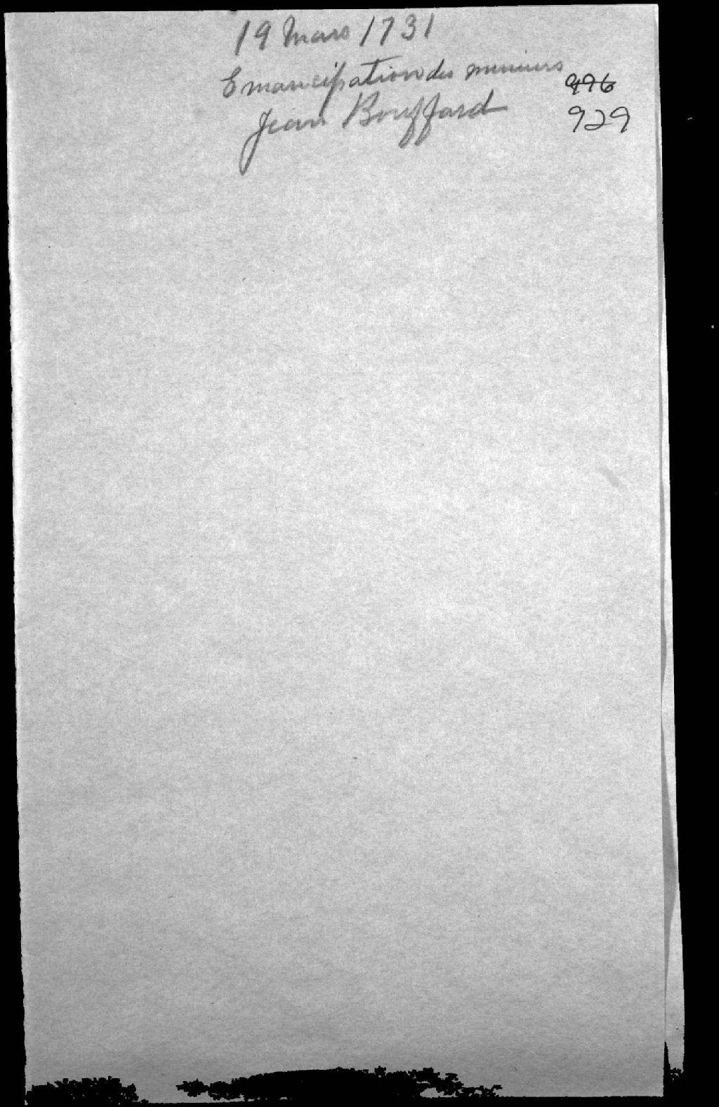 Émancipation des mineurs de feu Jean Bouffard, de Saint-Laurent, île d'Orléans, et de feue Marie-Françoise De Caruel (Decaruel), 19 mars 1731, Archives nationales à Québec, Fonds Cour supérieure. District judiciaire de Québec. Tutelles et curatelles, (03Q,CC301,S1,D929).