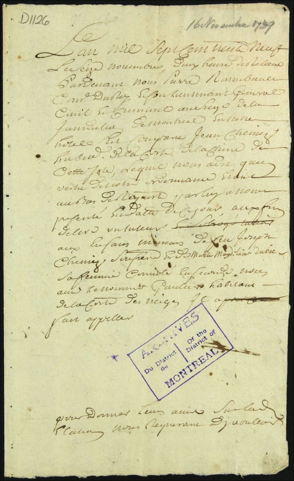 Tutelle des enfants mineurs de feu Joseph Chenier et de Marie Madeleine Duboct [Saint-Godard], 16 novembre 1739, Archives nationales à Montréal, Fonds Cour supérieure. District judiciaire de Montréal. Tutelles et curatelles, (06M,CC601,S1,SS1,D1126).