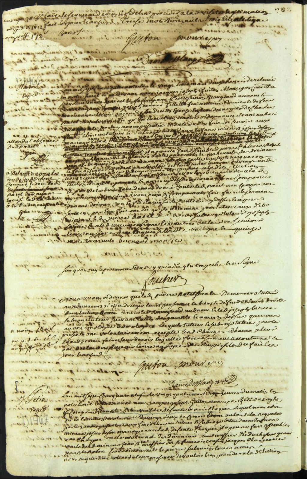 Tutelle des enfants mineurs de feu Marie Choquet [Champagne] et de Jean Baptiste [Lapré] Petit, 24 mars 1746, Archives nationales à Montréal, Fonds Cour supérieure. District judiciaire de Montréal. Tutelles et curatelles, (06M,CC601,S1,SS1,D1467).