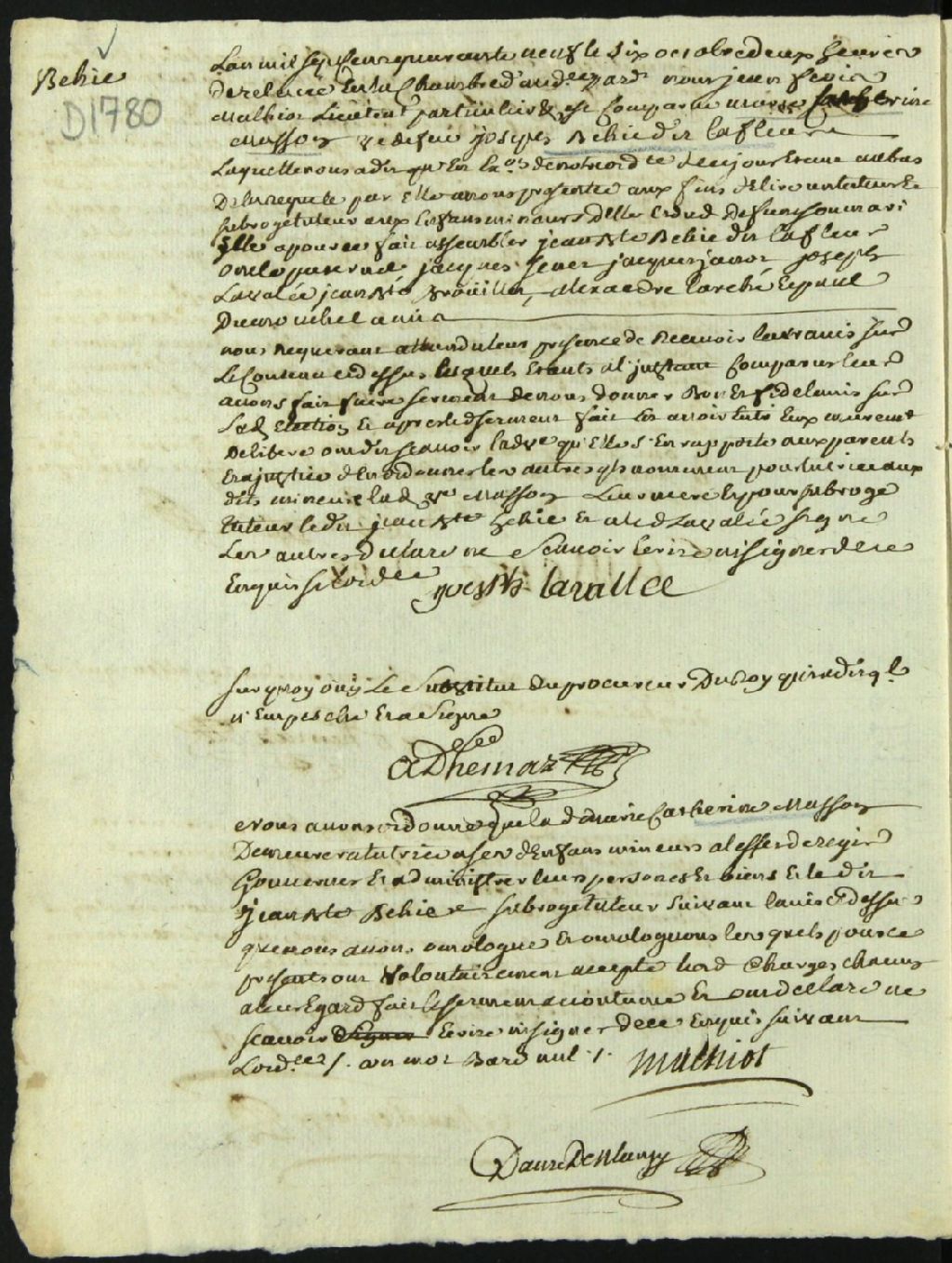 Tutelle des enfants mineurs de feu Joseph Béïque Lafleur et de Marie Catherine Masson, 6 octobre 1749, Archives nationales à Montréal, Fonds Cour supérieure. District judiciaire de Montréal. Tutelles et curatelles, (06M,CC601,S1,SS1,D1780).