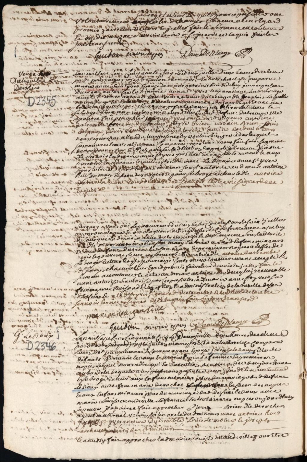 Tutelle des enfants mineurs des défunts Germain Leroux [Cardinal] et Marie Desroches [Desrochers], 2 juillet 1755, Archives nationales à Montréal, Fonds Cour supérieure. District judiciaire de Montréal. Tutelles et curatelles, (06M,CC601,S1,SS1,D2346).
