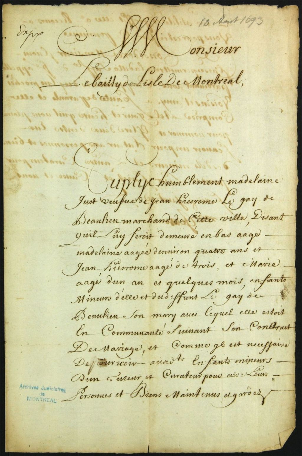 Tutelle et curatelle des enfants mineurs de feu Jean Jérôme Leguay de Beaulieu [Jean Jérôme Guay Beaulieu] et de Madeleine Just