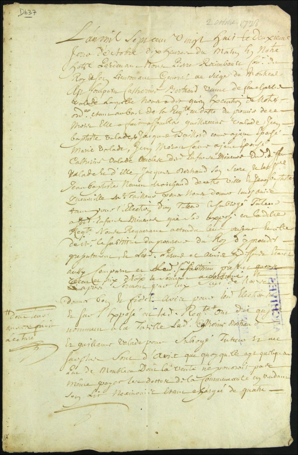 Tutelle des enfants mineurs de feu Charles Valade et de Catherine Bertrand, 2 octobre 1728, Archives nationales à Montréal, Fonds Cour supérieure. District judiciaire de Montréal. Tutelles et curatelles, (06M,CC601,S1,SS1,D637).