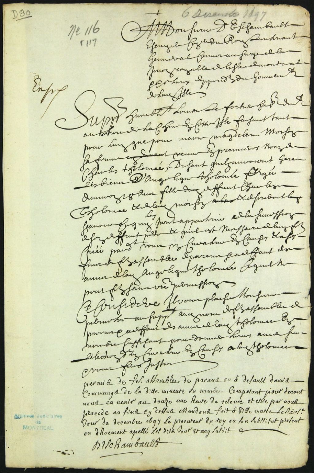 - Curatelle d'Angélique Ptolomée, fille mineure de feu Charles Ptolomée et de Madeleine Moison remariée à Louis Fortier