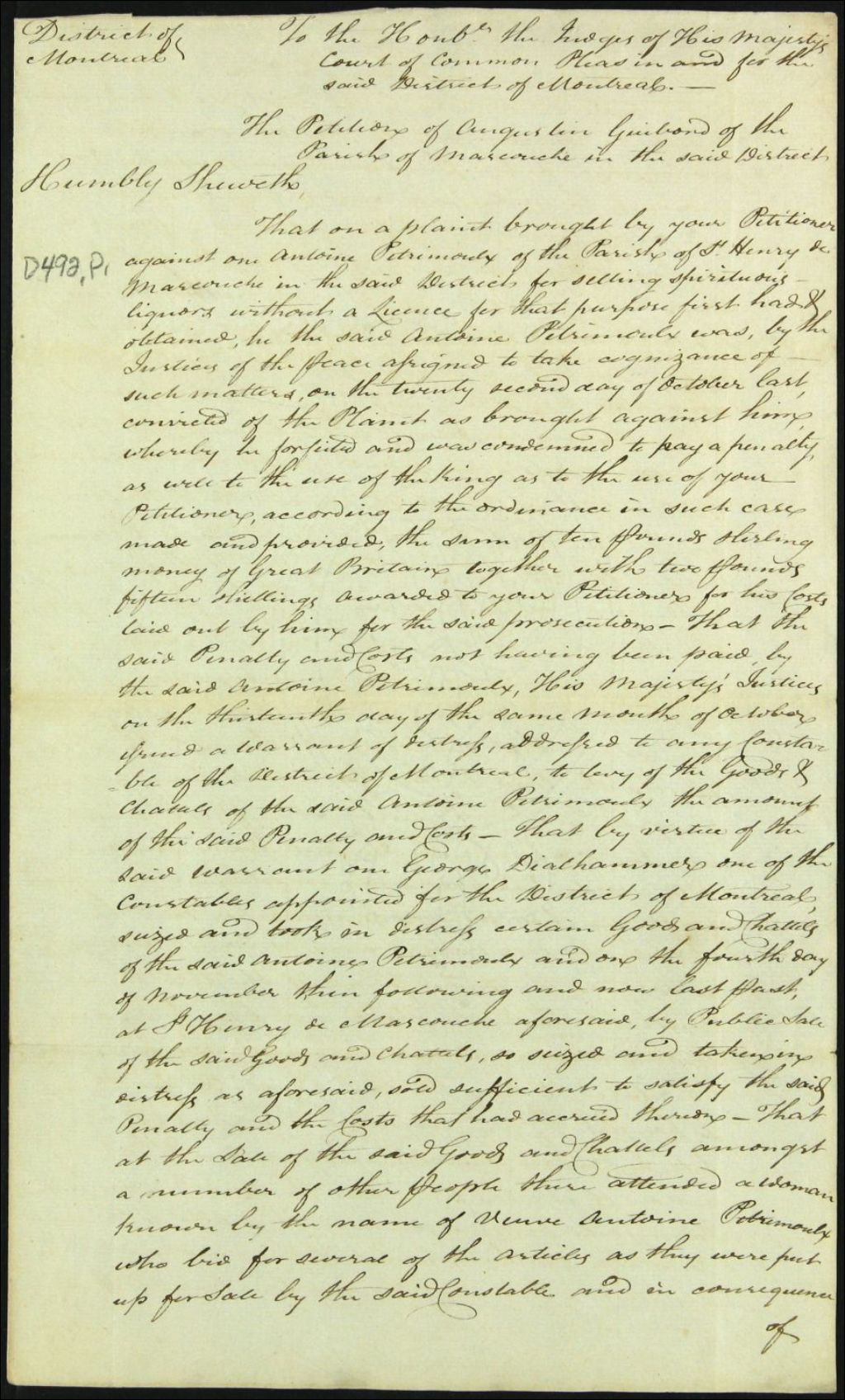 Curatelle à la succession vacantes de Geo Deilhammer, 19 février 1794, Archives nationales à Montréal, Fonds Cour supérieure. District judiciaire de Montréal. Tutelles et curatelles, (06M,CC601,S1,SS2,D492).