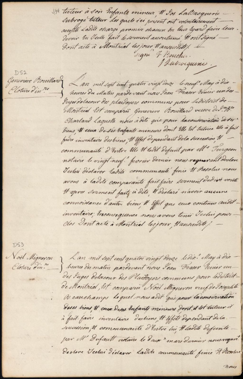 Tutelle des enfants mineurs de feu Josèphe Beauchamp et de Noël Migneron - Administration tutélaire, 10 mai 1792, Archives nationales à Montréal, Fonds Cour supérieure. District judiciaire de Montréal. Tutelles et curatelles, (06M,CC601,S1,SS2,D53).