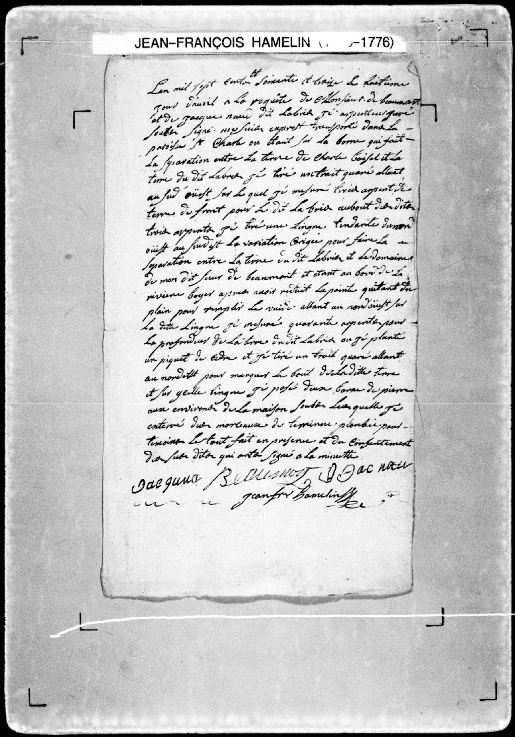 Procès-verbal de chaînage, lignes et bornes d'une terre située au bord de la rivière Boyer, dans la paroisse Saint-Charles. La présente pièce concerne directement: Jacques Naud dit Labrie (Nault) (arpenteur Jean-François Hamelin), 8 avril 1773, Archives nationales à Québec, Fonds Cour supérieure. District judiciaire de Québec. Greffes d'arpenteurs, (03Q,CA301,S23,P117).