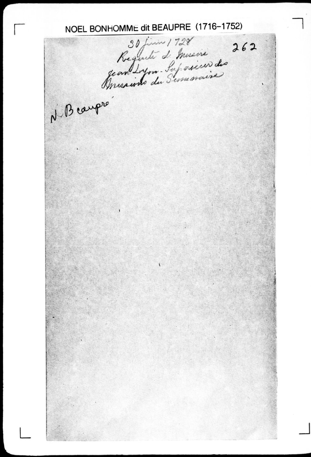 Procès-verbal de chaînage, lignes et bornes de six terres situées entre la clôture de la grève et l'endroit appelé Saint-Aubin où les terres aboutissent aux terres du domaine, à la Baie-Saint-Paul, [seigneurie de la Côte-de-Beaupré]. La présente pièce concerne directement: Jean Peron (Perron); Antoine Perron; Ange Simar (Simard); Jacques Duchesne; Étienne Simard; Pierre Perron (arpenteur Noël Bonhomme dit Beaupré), 30 juin 1728, Archives nationales à Québec, Fonds Cour supérieure. District judiciaire de Québec. Greffes d'arpenteurs, (03Q,CA301,S2,P294).