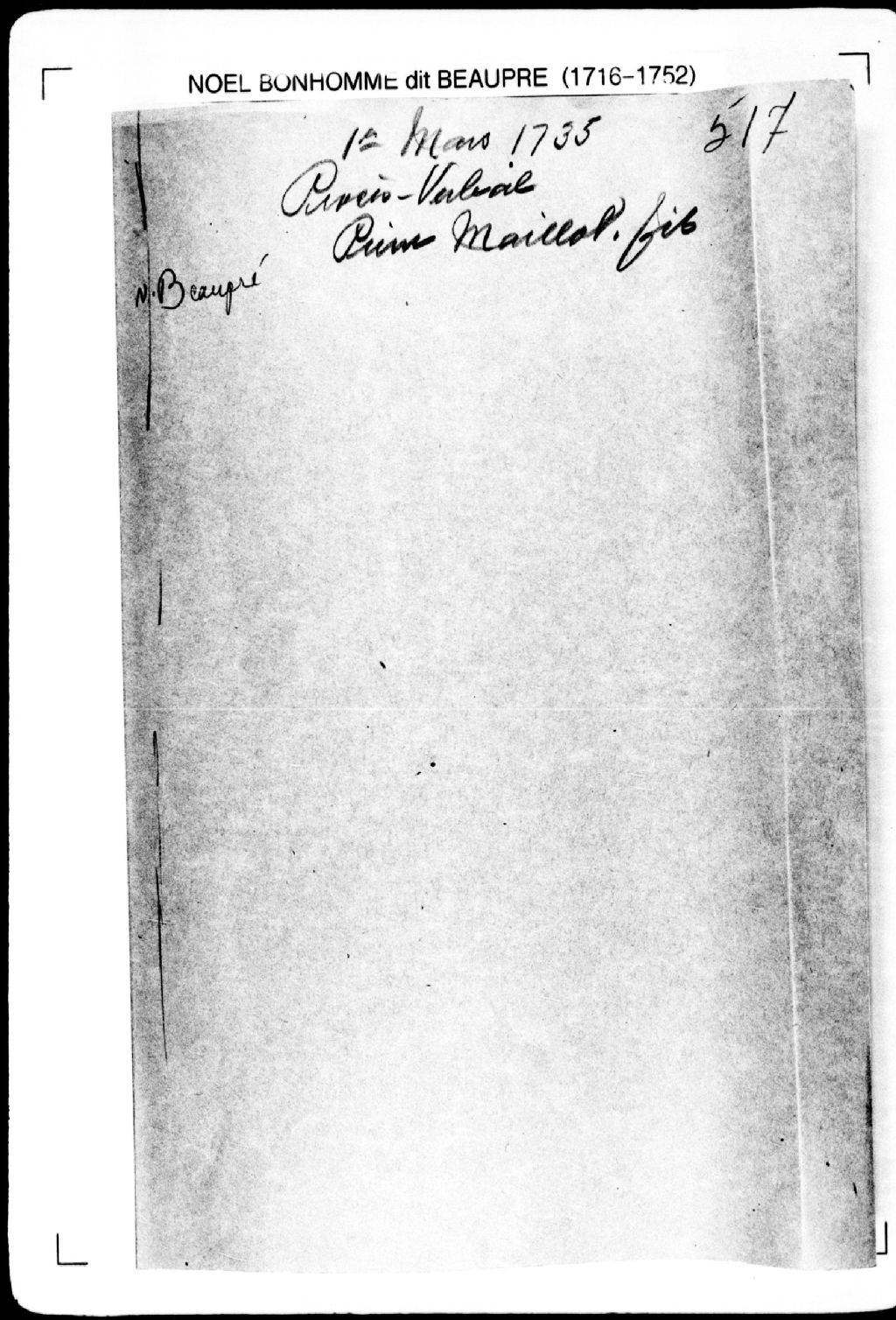 Procès-verbal de ligne et bornes séparant deux terres situées dans la seigneurie de la Rivière-Duchesne [seigneurie de Deschaillons]. La présente pièce concerne directement: Pierre Maillot (fils); Pierre Limousin (arpenteur Noël Bonhomme dit Beaupré), 1er mars 1735 - 31 mars 1735, Archives nationales à Québec, Fonds Cour supérieure. District judiciaire de Québec. Greffes d'arpenteurs, (03Q,CA301,S2,P561).
