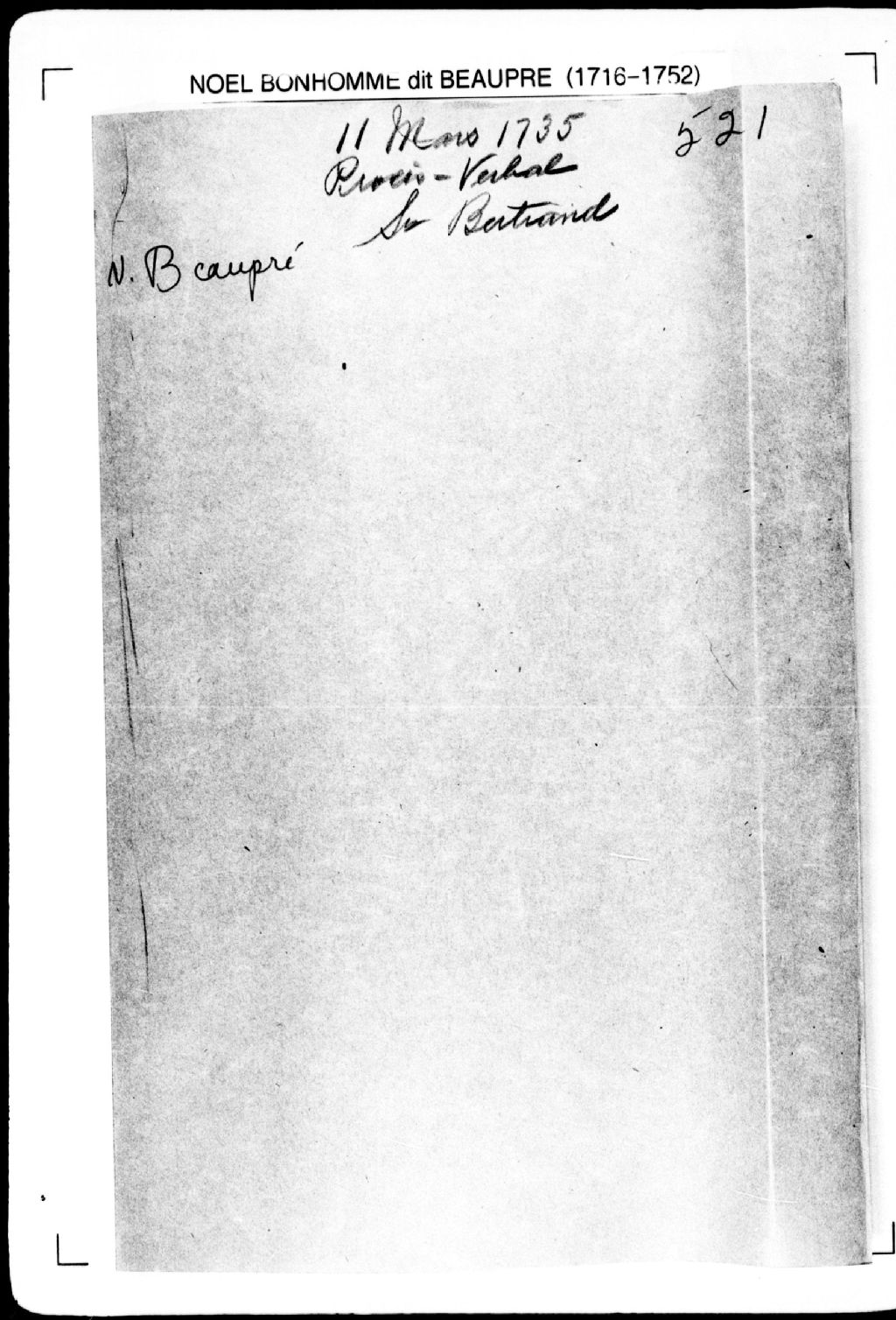 Procès-verbal de chaînage, ligne et bornes d'une terre située sur le bord du lac Saint-Pierre, au-dessous du moulin, dans la seigneurie de Tonnancour. La présente pièce concerne directement: René Bertrand (arpenteur Noël Bonhomme dit Beaupré), 11 mars 1735, Archives nationales à Québec, Fonds Cour supérieure. District judiciaire de Québec. Greffes d'arpenteurs, (03Q,CA301,S2,P565).