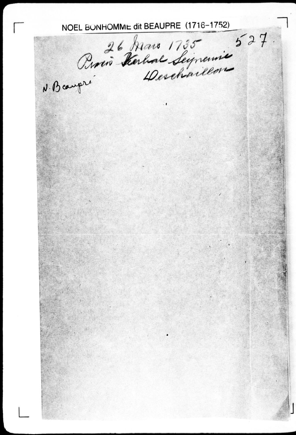 Procès-verbal de chaînage, lignes et bornes de six terres situées dans la seigneurie de Deschaillons. La présente pièce concerne directement: Joseph Houle (Houde); Jean Hubert; François Montreuil; le nommé Sensregret (Sansregret); Joachim Maillot; Joseph Goront (Gauron) (arpenteur Noël Bonhomme dit Beaupré), 26 mars 1735, Archives nationales à Québec, Fonds Cour supérieure. District judiciaire de Québec. Greffes d'arpenteurs, (03Q,CA301,S2,P571).