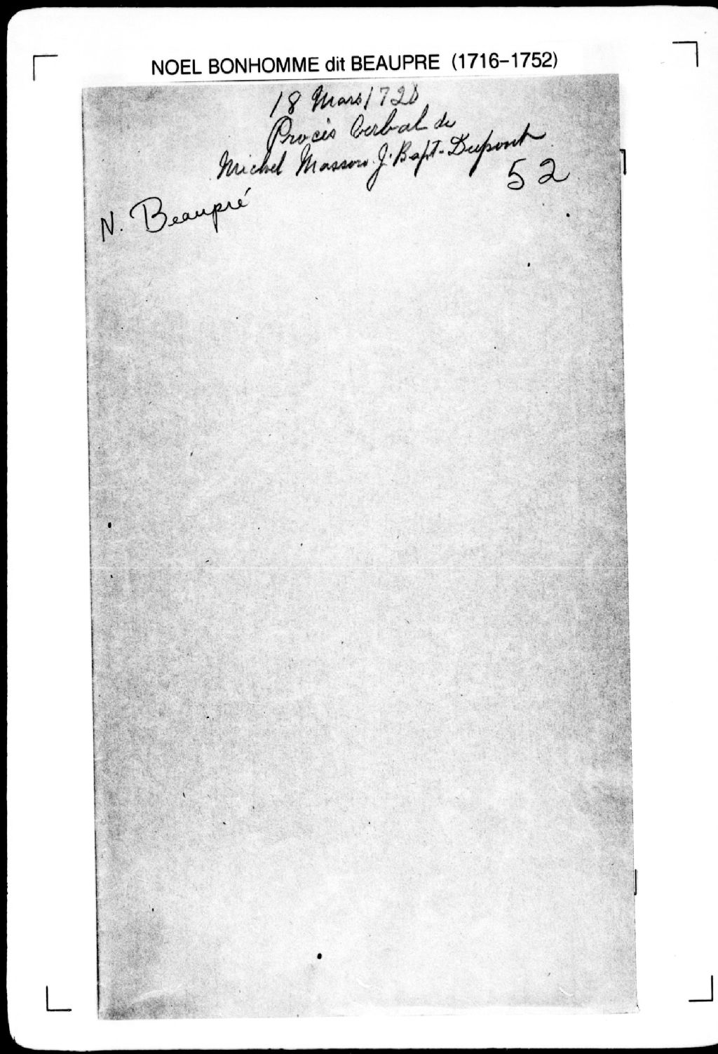 Procès-verbal de chaînage, lignes et bornes de trois terres situées le long du fleuve Saint-Laurent, seigneurie du Cap-de-la-Madeleine. La présente pièce concerne directement: Michel Masson; Jean-Baptiste Dupont; Thomas Pinot (Pineau) (arpenteur Noël Bonhomme dit Beaupré), 18 mars 1720, Archives nationales à Québec, Fonds Cour supérieure. District judiciaire de Québec. Greffes d'arpenteurs, (03Q,CA301,S2,P61).