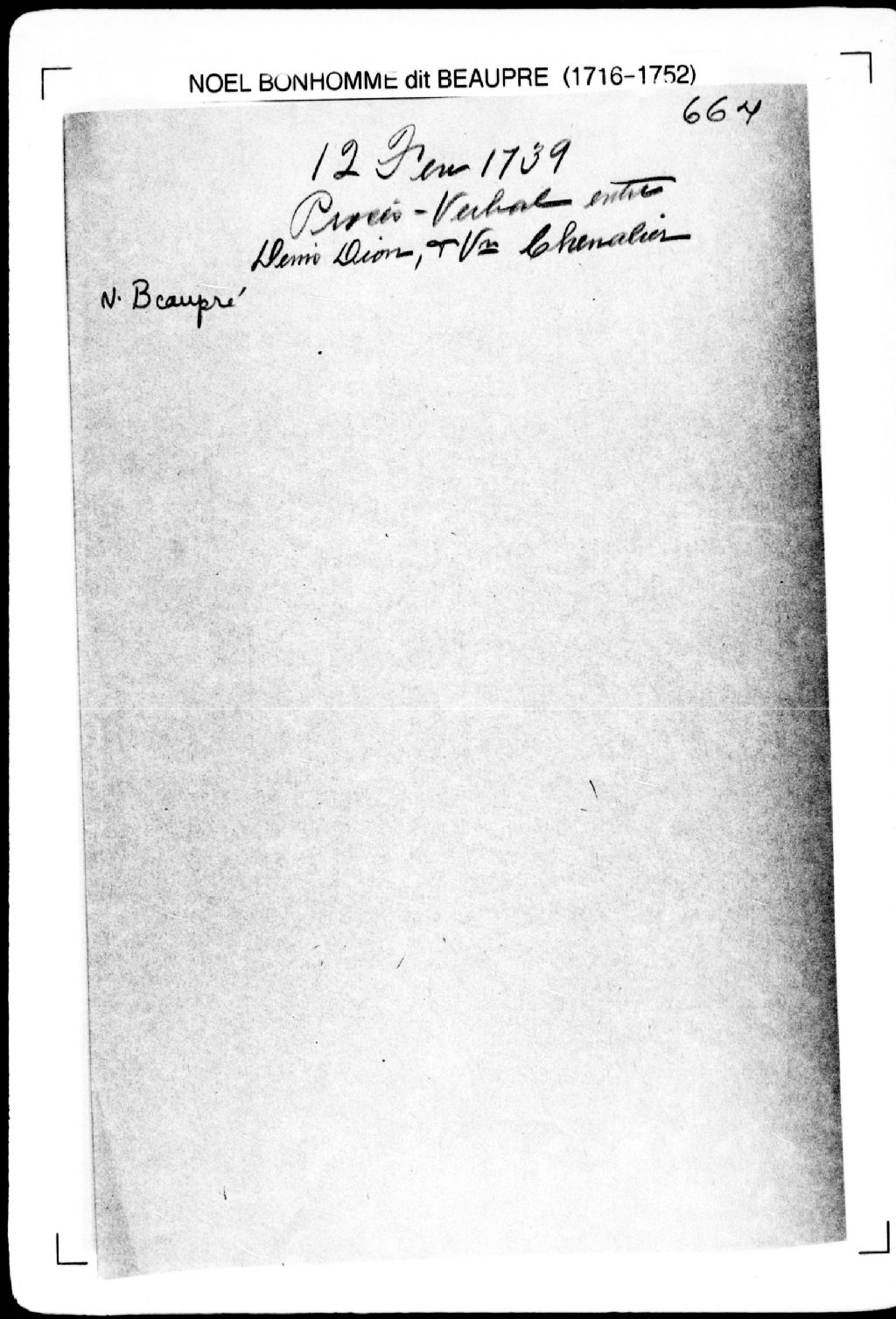 Procès-verbal de ligne séparant deux terres à la suite d'un empiètement, lesquelles terres étant situées à la Petite-Rivière-Saint-Charles. La présente pièce concerne directement: Joseph Dion; Denis Dion; la veuve Chevalier (arpenteur Noël Bonhomme dit Beaupré), 12 février 1739, Archives nationales à Québec, Fonds Cour supérieure. District judiciaire de Québec. Greffes d'arpenteurs, (03Q,CA301,S2,P709).