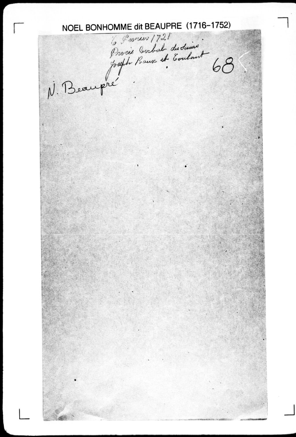 Procès-verbal de ligne et bornes séparant deux terres situées sur la ligne qui sépare les terres des Révérends Pères Jésuites [seigneurie du Cap-de-la-Madeleine] d'avec celles du sieur de Champlaint (Champlain) (seigneurie de Champlain). La présente pièce concerne directement: Joseph Raux (Rault); Joseph Toutant (arpenteur Noël Bonhomme dit Beaupré), 6 février 1721, Archives nationales à Québec, Fonds Cour supérieure. District judiciaire de Québec. Greffes d'arpenteurs, (03Q,CA301,S2,P79).