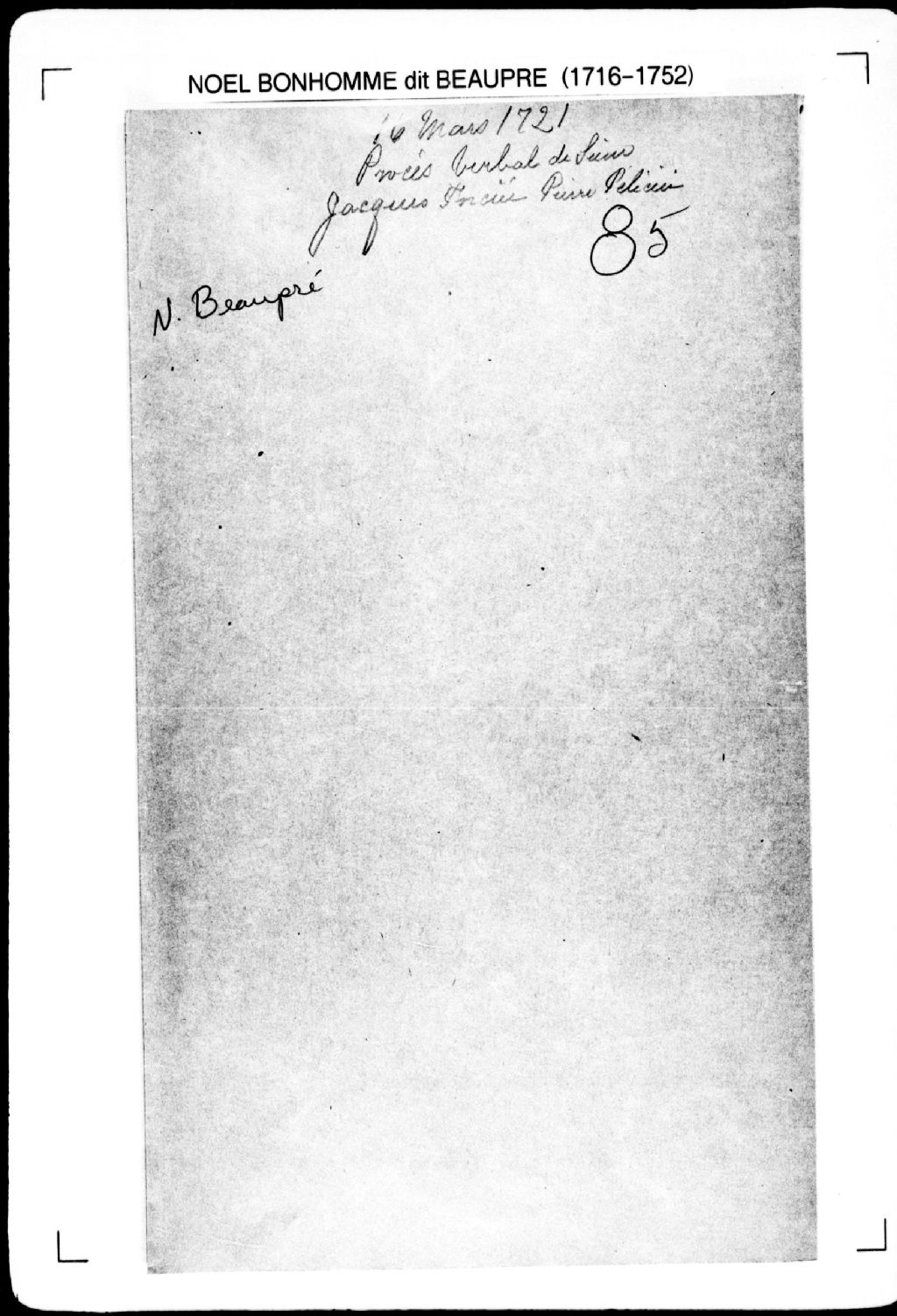 Procès-verbal de ligne et bornes séparant deux terres situées à la rivière Yamaska, le long de ladite rivière, du côté du nord-est, seigneurie de Yamaska. La présente pièce concerne directement: Jacques Forcier; Pierre Pelicier (Pélissier) (arpenteur Noël Bonhomme dit Beaupré), 16 mars 1721, Archives nationales à Québec, Fonds Cour supérieure. District judiciaire de Québec. Greffes d'arpenteurs, (03Q,CA301,S2,P97).