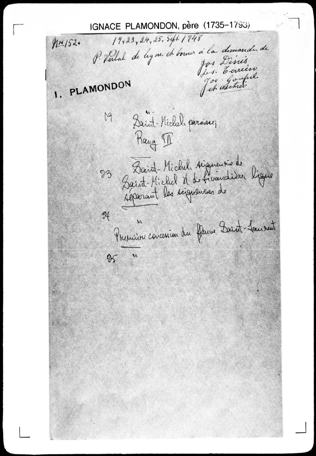 Procès-verbal de chaînage, lignes et bornes de cinq terres et de leur profondeur, lesquelles terres étant situées au sud-est de la rivière Boyer, dans la paroisse de Saint-Michel, seigneurie de La Durantaye. La présente pièce concerne directement: Joseph Denis dit Lapierre; Louis Terrien (Therrien); Joseph Coupy (Goupil); Jean-Baptiste Leclaier (Leclair, Leclerc); les nommés Blond (Leblond) (arpenteur Ignace Plamondon père), 19 septembre 1748, Archives nationales à Québec, Fonds Cour supérieure. District judiciaire de Québec. Greffes d'arpenteurs, (03Q,CA301,S43,P152-1).