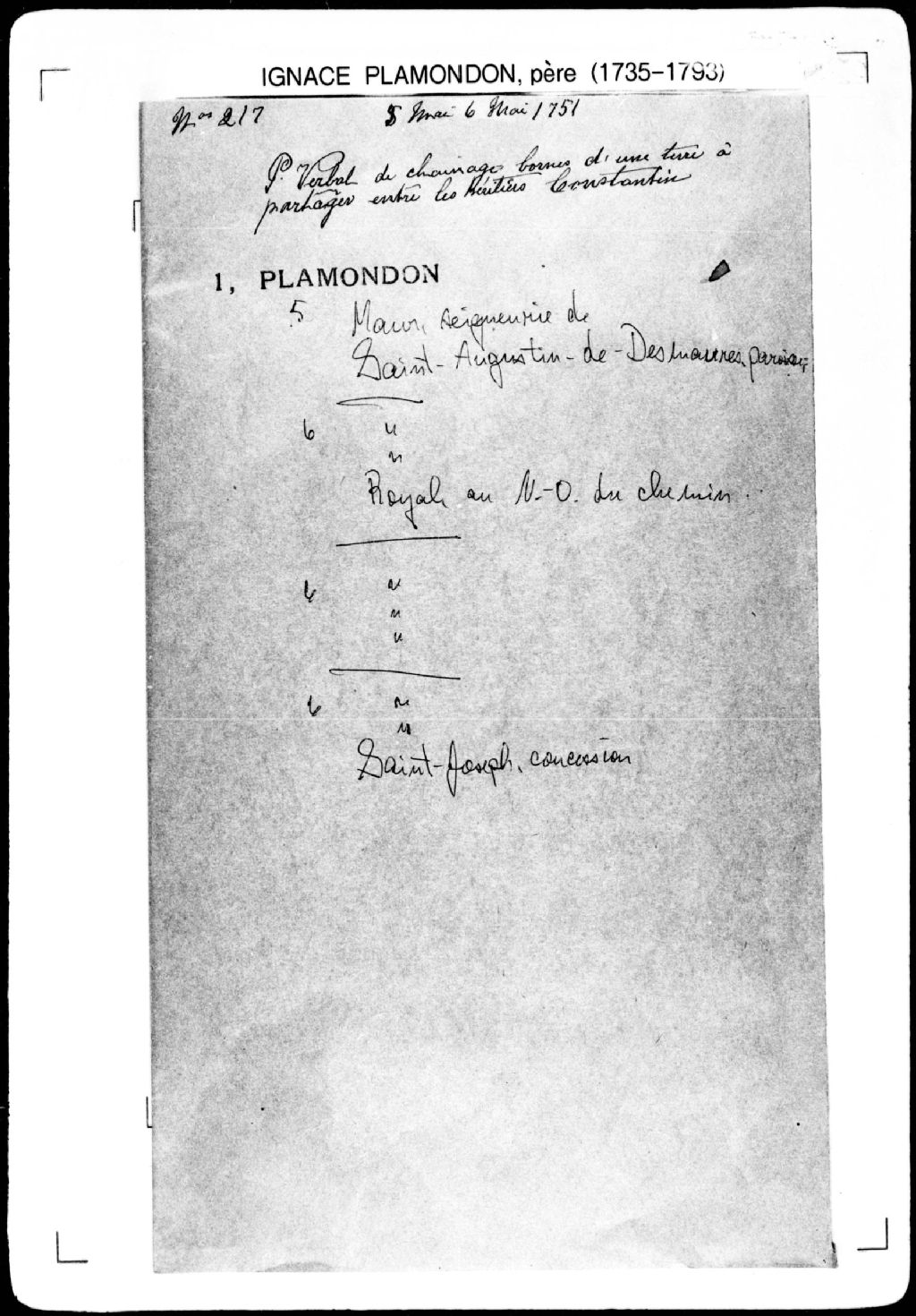 - Procès-verbal de partage de trois terres entre les héritiers du feu sieur Constantin et de feue Marguerite-Suzanne de Rouvraies (Rouvray, DuRouvray), de chaînage, lignes et bornes des portions et de leur répartition entre lesdits héritiers, lesquelles terres étant situées au bord de l'eau, dans la seigneurie de Saint-Augustin [seigneurie de Maur].