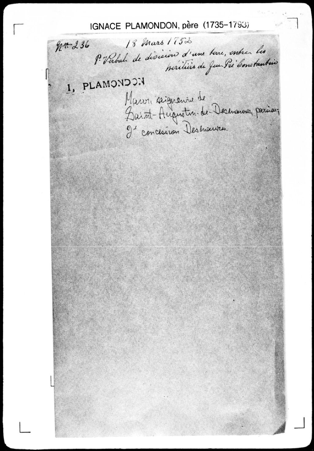 Procès-verbal de partage d'une terre entre les héritiers de feu Pierre Constantin et de feue Marguerite-Suzanne Guyon et de chaînage, lignes et bornes des portions, suivant l'acte de partage passé devant le notaire Simon Sanguinet, laquelle terre étant située à la seconde concession, dans la paroisse de Saint-Augustin, seigneurie de Maur., 18 mars 1752, Archives nationales à Québec, Fonds Cour supérieure. District judiciaire de Québec. Greffes d'arpenteurs, (03Q,CA301,S43,P236).