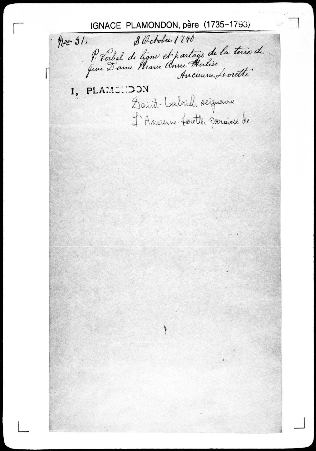 - Procès-verbal d'acceptation par Louis Guieptiers (Leguestier, Guestier, Gueptier), héritier de feue Marie-Anne Ulain (Hulin), de la moitié d'une maison comme part d'héritage dans la succession de ladite Hulin, moyennant le remboursement d'une certaine somme aux cohéritiers, laquelle maison étant située dans la [paroisse de L'Ancienne-Lorette], [seigneurie de Saint-Gabriel].