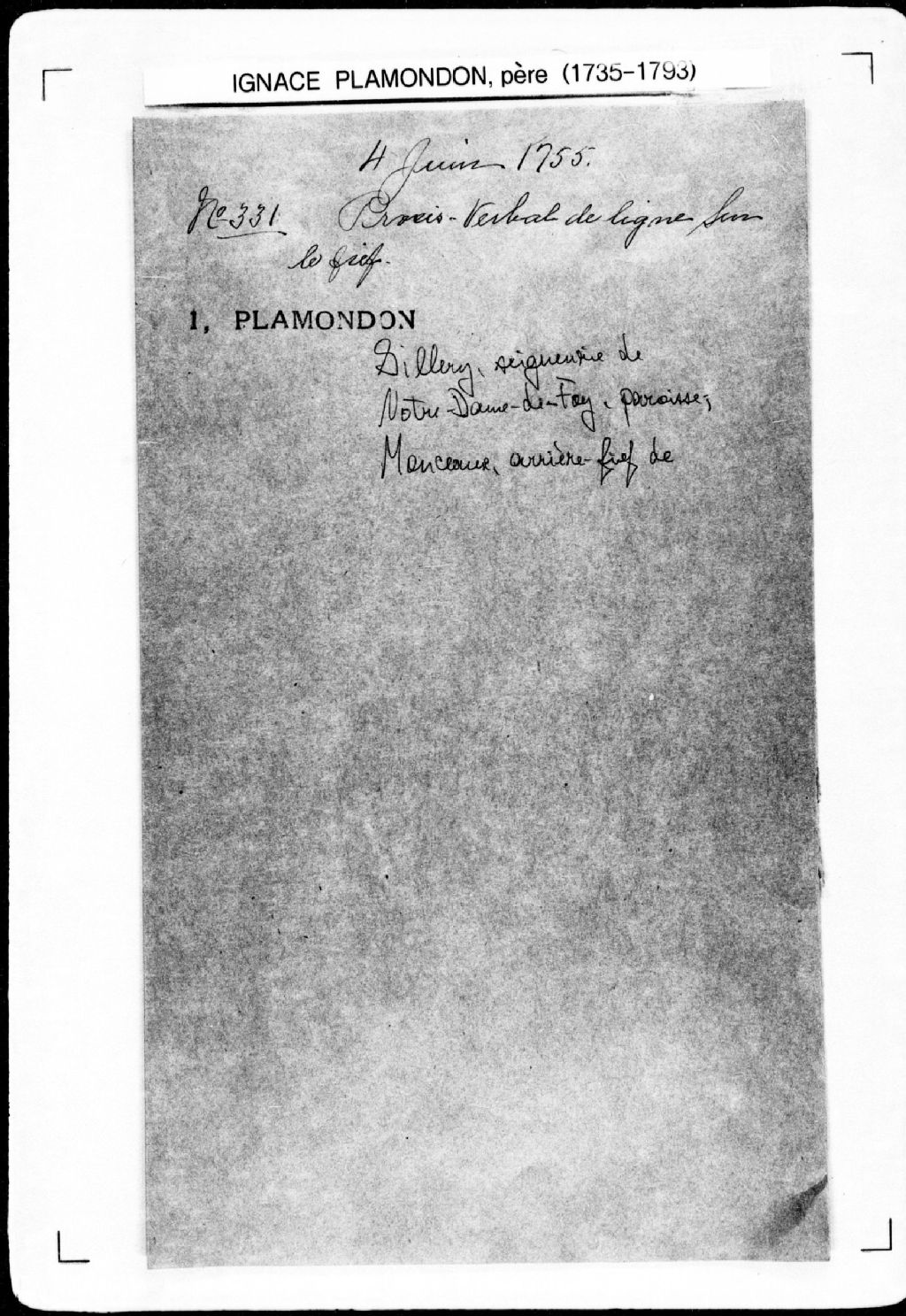 Procès-verbal de chaînage et ligne de quatre terres situées sur le fleuve Saint-Laurent, dans la paroisse Notre-Dame-de-Foy, dans l'arrière-fief de Monceaux, seigneurie de Sillery. La présente pièce concerne directement: le nommé Bonhomme; Prisque Lapointe; Pierre Montreuiel (Montreuil); Jean Leclaier (Leclair, Leclerc, Petitclair); les héritiers du feu sieur Deauteuiel (d'Auteuil, Dauteuil) (arpenteur Ignace Plamondon père), 4 juin 1755, Archives nationales à Québec, Fonds Cour supérieure. District judiciaire de Québec. Greffes d'arpenteurs, (03Q,CA301,S43,P331).