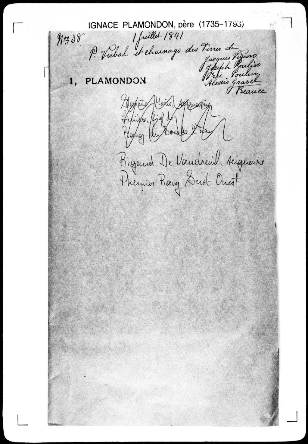 Procès-verbal de chaînage, lignes et bornes de six terres situées en la Nouvelle-Beauce, le long de la rivière du saut de la Chaudière, au sud-ouest de ladite rivière (pour Joseph Jacquau et Guillaume Gosselin), au nord-est de ladite rivière (pour Jacques Jacquau), au nord-ouest de la petite ferme (pour Jean-Baptiste Squerré dit Labbé, Jean Morel et Joseph Perron), dans la seigneurie de Fleury [seigneurie de Saint-Joseph-de-Beauce]., 3 juillet 1741, Archives nationales à Québec, Fonds Cour supérieure. District judiciaire de Québec. Greffes d'arpenteurs, (03Q,CA301,S43,P38-4).
