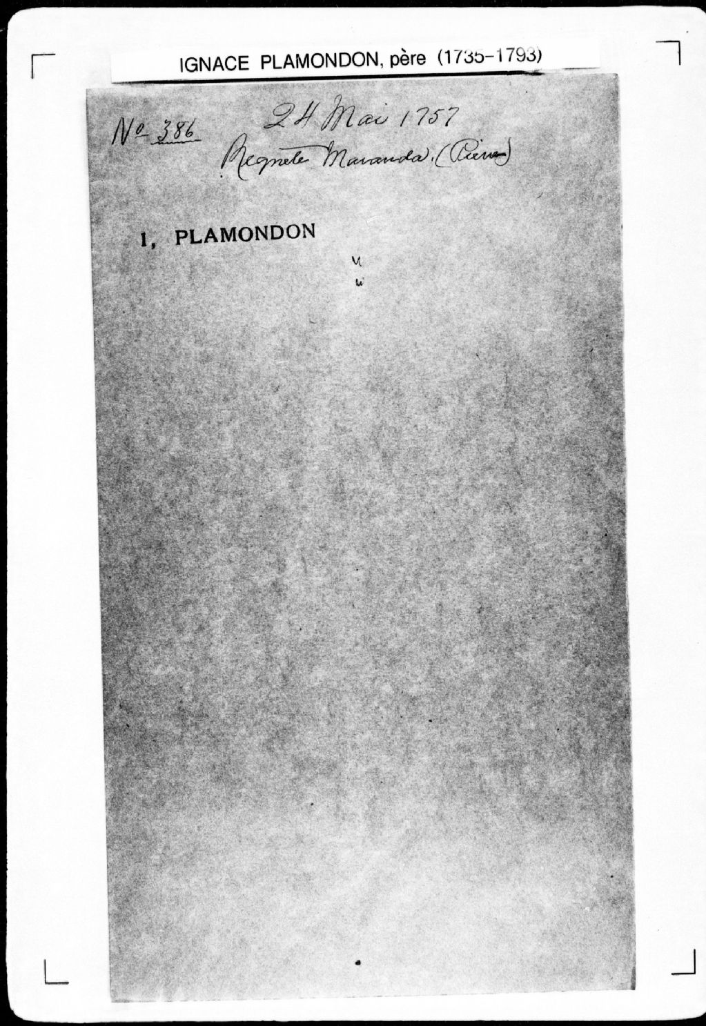 Procès-verbal de partage d'une terre et de chaînage, ligne et bornes des portions, laquelle terre étant située à la côte Saint-Paul, près du chemin Royal, dans la paroisse de L'Ancienne-Lorette, seigneurie de Saint-Gabriel. La présente pièce concerne directement: Joachim Primo (Primeau); François Maranda, fils de Pierre Maranda (arpenteur Ignace Plamondon père), 24 mai 1757, Archives nationales à Québec, Fonds Cour supérieure. District judiciaire de Québec. Greffes d'arpenteurs, (03Q,CA301,S43,P386).