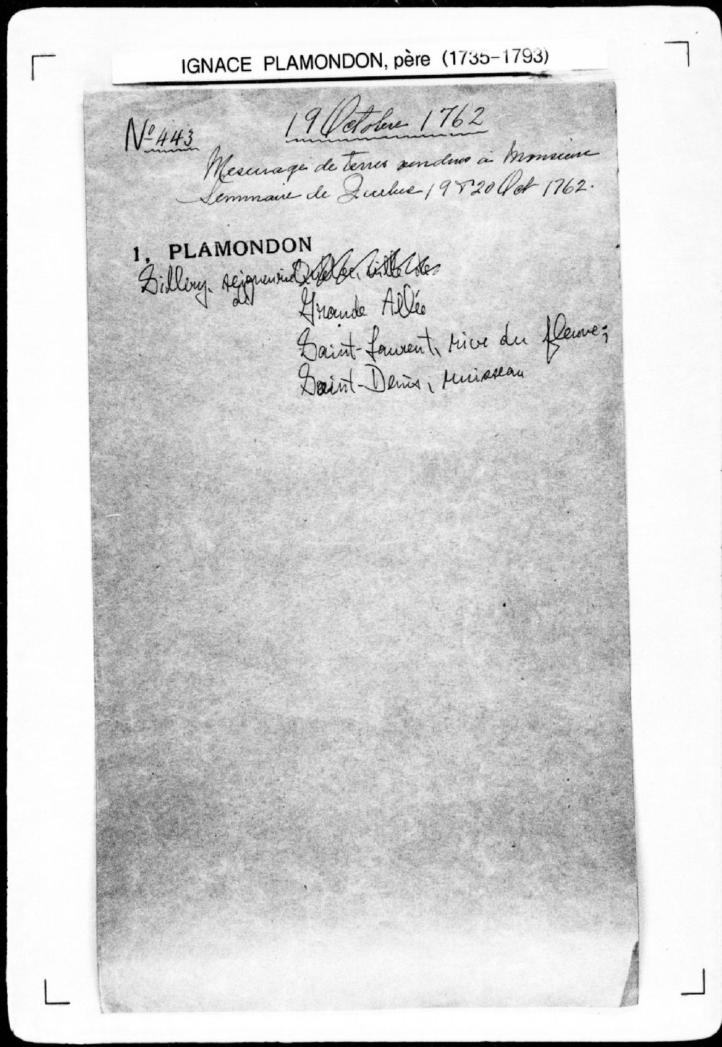 - Procès-verbal de chaînage d'une terre jusqu'au ruisseau Saint-Denis et de levée du plan dudit ruisseau s'y trouvant, par ordre de Jacques (James) Murray, gouverneur général du gouvernement de Québec, laquelle terre étant située sur la Grande-Allée et sur le fleuve Saint-Laurent, dans la banlieue de Québec, attenant au fief Bourdon.