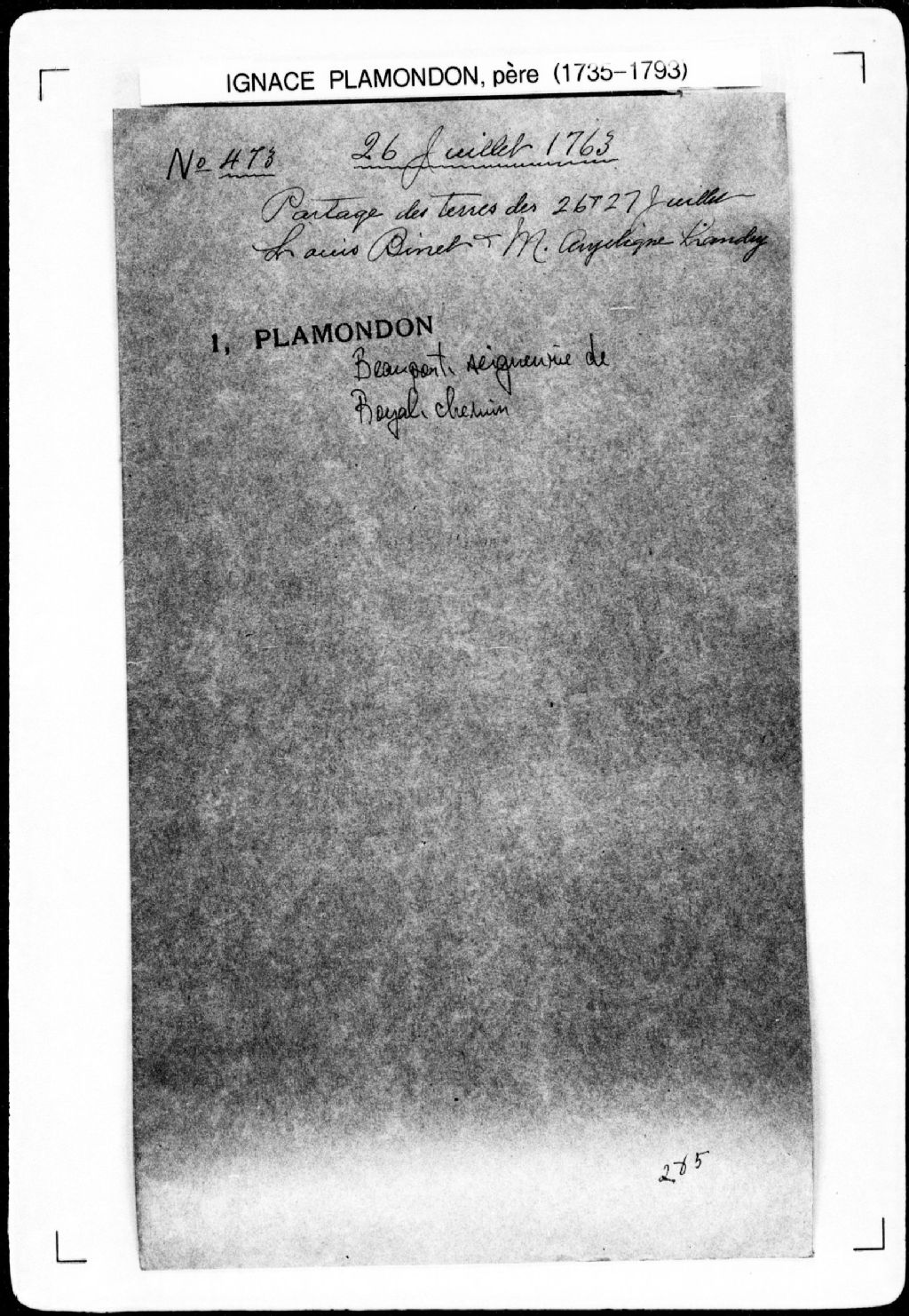 Procès-verbal de vérification d'un procès-verbal d'arpentage relatif au partage d'une terre entre les héritiers de feu Louis Binette (Binet) et de feue Marie-Angélique Landry, en vertu d'un arrêt de la Cour et Conseil militaire de Québec, laquelle terre étant située sur le chemin Royal, au lieu nommé le Petit-Pommier, jusqu'à la grande côte de la grève, dans la seigneurie de Beauport., 26 juillet 1763 - 27 juillet 1763, Archives nationales à Québec, Fonds Cour supérieure. District judiciaire de Québec. Greffes d'arpenteurs, (03Q,CA301,S43,P473).