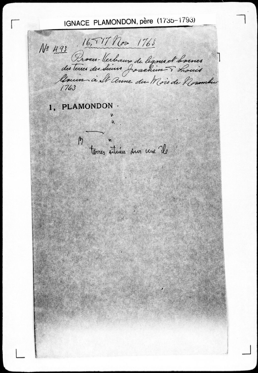 Procès-verbal de ligne et bornes séparant deux terres situées sur une île, dans la seigneurie de Sainte-Anne-[de-la-Pérade]. La présente pièce concerne directement: Louis Gouin; Joseph Maillou (Mailloux) (arpenteur Ignace Plamondon père), 17 novembre 1763, Archives nationales à Québec, Fonds Cour supérieure. District judiciaire de Québec. Greffes d'arpenteurs, (03Q,CA301,S43,P493-2).