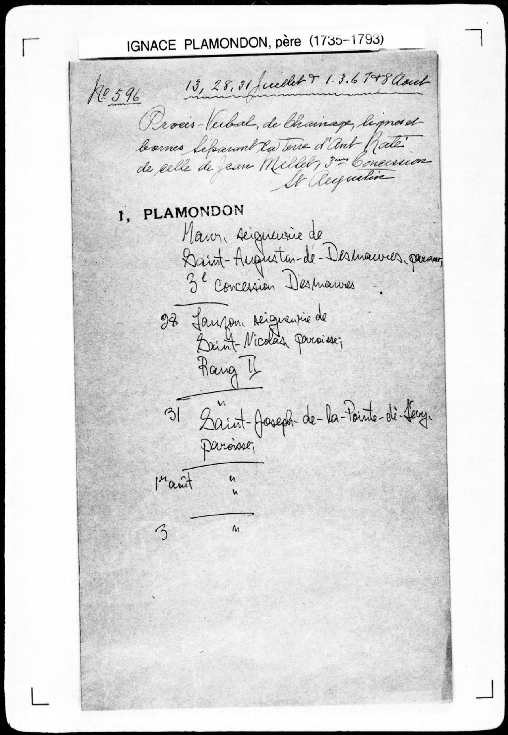 Procès-verbal de levée du plan du fleuve Saint-Laurent, depuis et compris le fief Sainte-Anne jusqu'au fief des Révérends Pères Jésuites du Collège de Québec, lesquels fiefs étant enclavés dans la seigneurie de Lauzon, puis de chaînage de la profondeur d'une concession sur le fleuve Saint-Laurent. La présente pièce concerne directement: Jean-Baptiste Bégin (arpenteur Ignace Plamondon père), 3 août 1767, Archives nationales à Québec, Fonds Cour supérieure. District judiciaire de Québec. Greffes d'arpenteurs, (03Q,CA301,S43,P596-5).
