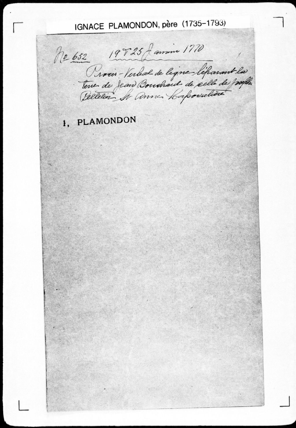 Procès-verbal de ligne séparant deux terres et de chaînage et partage d'une desdites terres, lesquelles terres étant situées à la première concession, sur le fleuve Saint-Laurent, près du chemin Royal, dans la [seigneurie de La Pocatière]. La présente pièce concerne directement: Jean Guay; Germain Peltier (Pelletier); Joseph Peltier (Pelletier); Michel Peltier (Pelletier); Pierre Petit; Baptiste Peltier (Pelletier) (arpenteur Ignace Plamondon père), 25 janvier 1770, Archives nationales à Québec, Fonds Cour supérieure. District judiciaire de Québec. Greffes d'arpenteurs, (03Q,CA301,S43,P652-2).