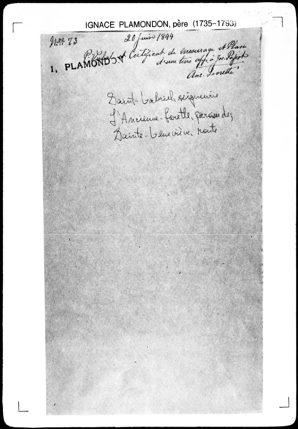 Procès-verbal de chaînage et lignes d'un morceau de terre en figure de trapèze et plan dudit arpentage, lequel morceau de terre étant situé sur la route Sainte-Geneviève, dans la seigneurie de Saint-Gabriel. La présente pièce concerne directement: Joseph Pagot (fils) (Pageot, Pageau) (arpenteur Ignace Plamondon père), 20 juin 1744, Archives nationales à Québec, Fonds Cour supérieure. District judiciaire de Québec. Greffes d'arpenteurs, (03Q,CA301,S43,P73).