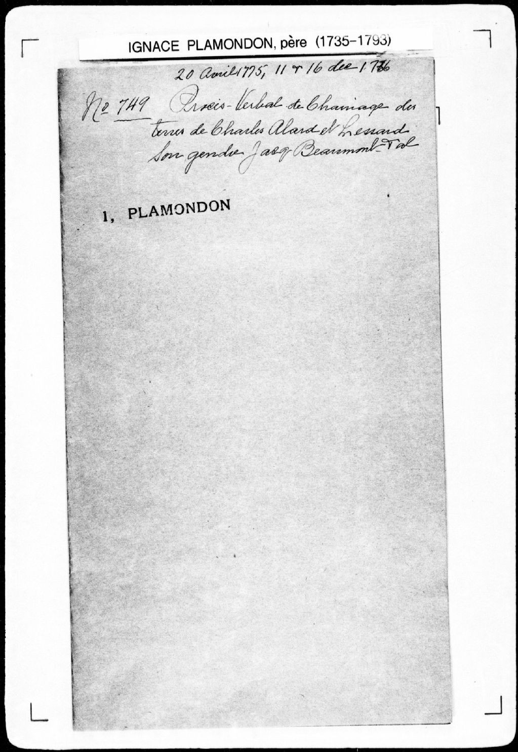 La pièce se compose du procès-verbal de chaînage, lignes et bornes de plusieurs terres situées au lieu nommé la Montagne-Ronde, dans la seigneurie de Saint-Gabriel. Elle concerne directement: Charles Alard (Allard), beau-père du nommé Lessard; le nommé Lessard, gendre de Charles Allard; Jacques Beaumon (Beaumont); François Lereau (Lhéros); Pierre Frichet (Fréchet, Fréchette); Pierre Alard (Allard), du village; le nommé Jolicoeur; Michel-Bernard Renaud; le nommé Garnaud (Garneau), de Sainte-Geneviève; Jean-Bernard Renaud (père); François Peupin (Pépin); Jean-Antoine Bédard et indirectement un propriétaire voisin: Jean Alard (Allard).
