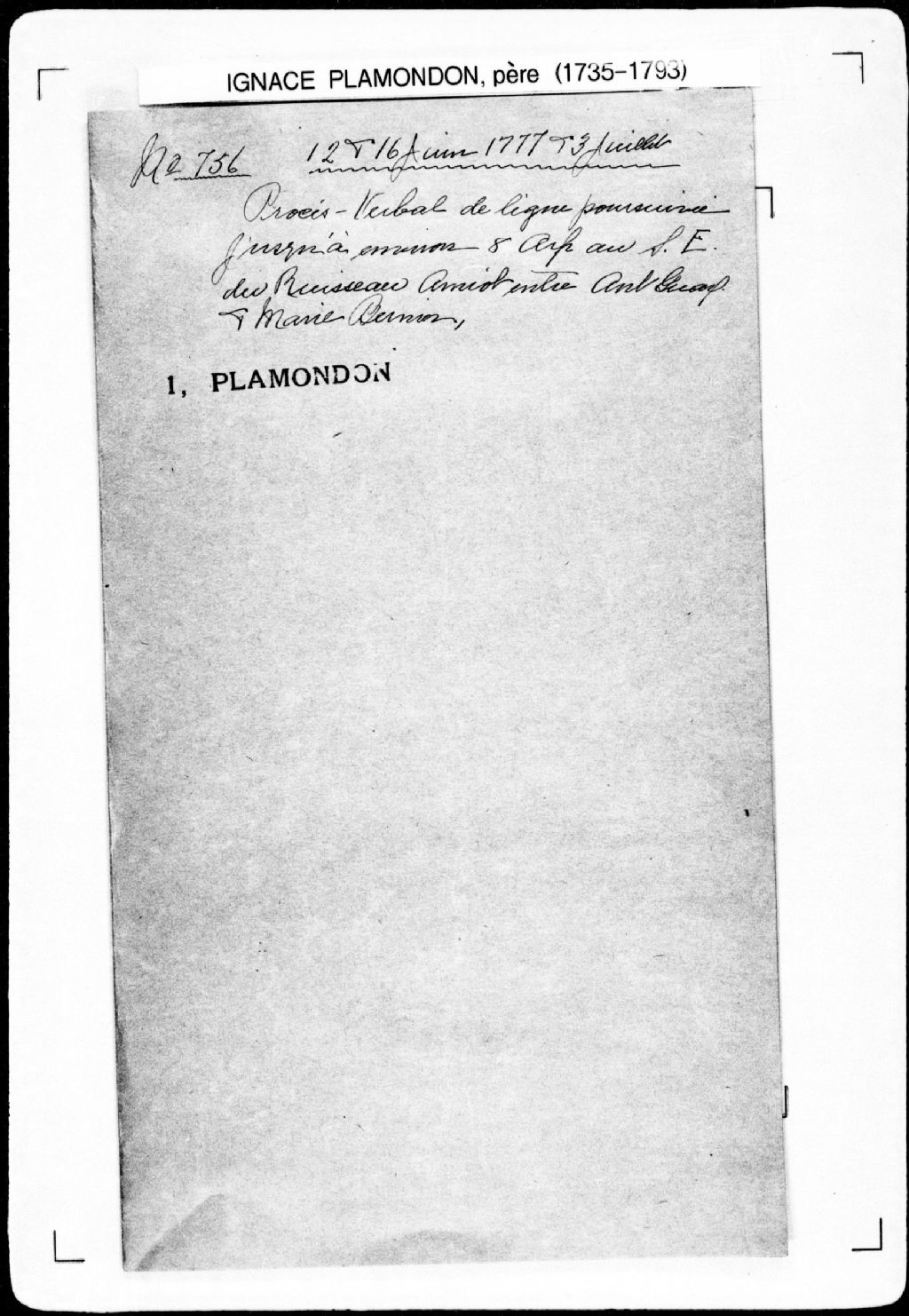Procès-verbal d'estimation de la quantité de bois coupé sur des terres, par ordre de la Cour des Plaidoyers communs du district de Québec en date du 30 mai 1777, lesquelles terres étant situées à la troisième concession, dans la seigneurie de Saint-Vallier. La présente pièce concerne directement: Jean-Laurent Roy; Alexandre Roy (arpenteur Ignace Plamondon père; Jacques Gendron et Joseph Lemieux, arbitres), 16 juin 1777, Archives nationales à Québec, Fonds Cour supérieure. District judiciaire de Québec. Greffes d'arpenteurs, (03Q,CA301,S43,P756-2).